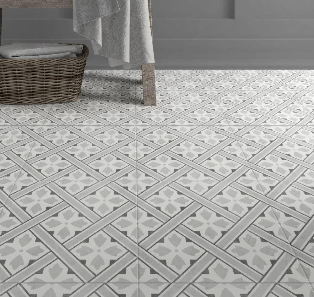 Porcelain flat matt patterned tiles with soft grey toned detail. These tiles are suitable for use on wall or floor.